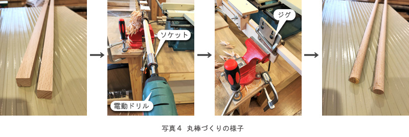 木のねじをつくるには、まず角材が必要です。角材が準備できたら、写真4のように電動ドリルと専用のジグを使って加工します。